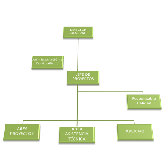 La empresa consta de varios departamentos técnicos con el fin de optimizar y organizar la producción. Aparte del departamento externo de contabilidad la empresa se centra en los departamentos de Proyectos y Asistencia Técnica y Obras donde se desarrolla la mayor parte del trabajo, y un departamento de I+D donde se desarrollan los diferentes programas informáticos y estudios técnicos de investigación que le empresa lleva a cabo.